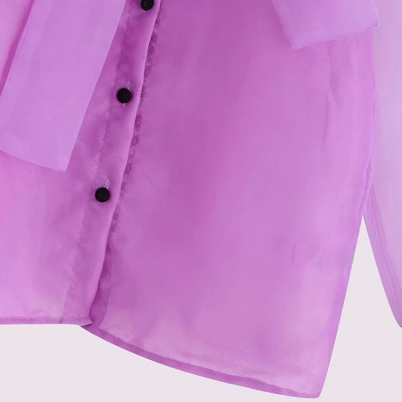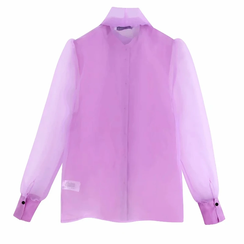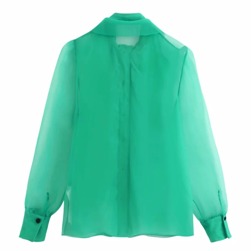 astounding women solid color bow collar organza casual smock Shirts blouses women long sleeve transparent roup