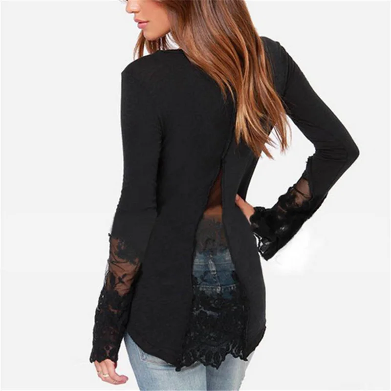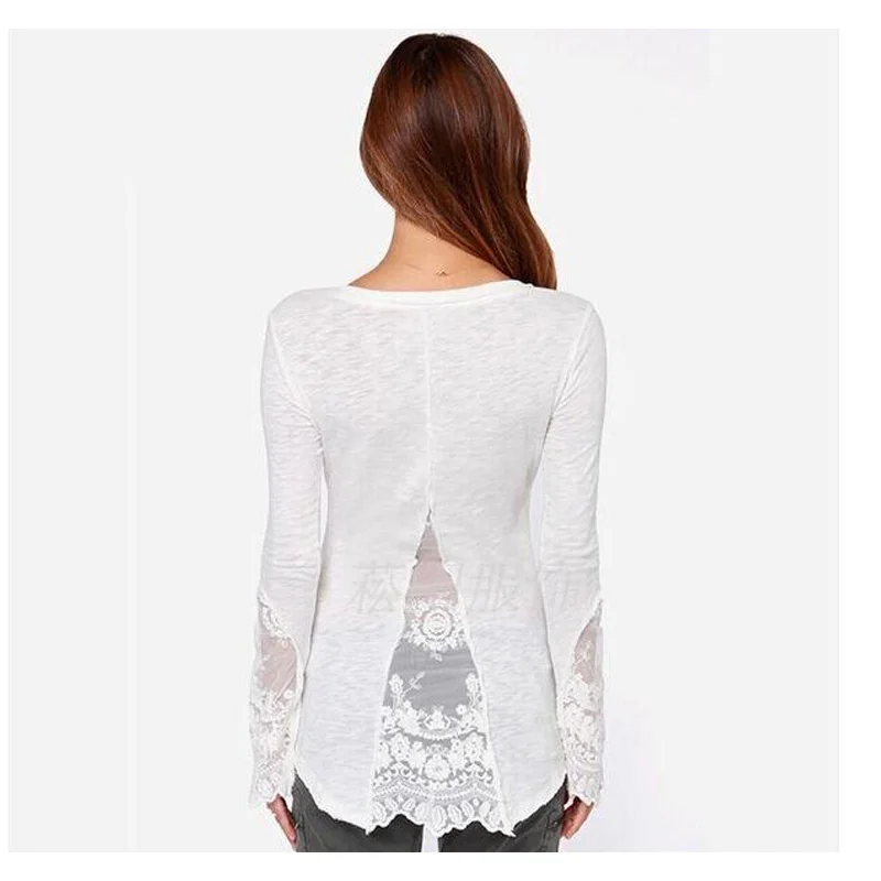 remarkable Women's Embroidery Crochet Knitted mesh lace stitching sleeve blouse back split shirt hollow FS0236