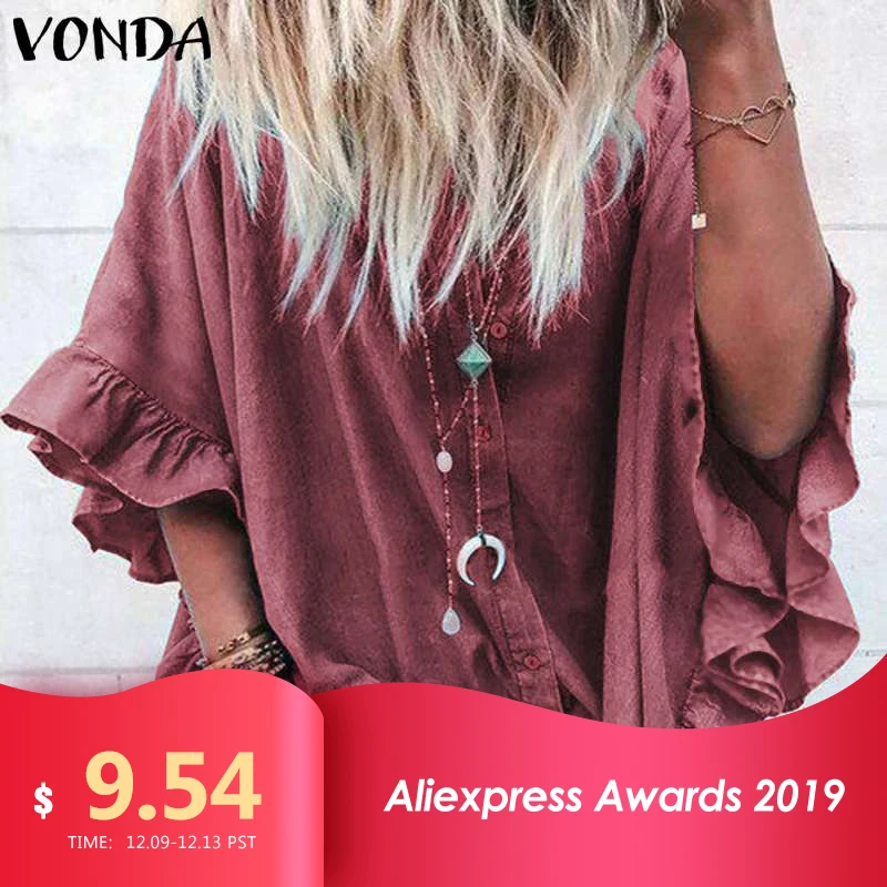 lower price VONDA Blouse Women 2019 Casual Loose Lapel Neck Sleeve Ruffle Blouse Sexy Office Ladies Shirts Tuni