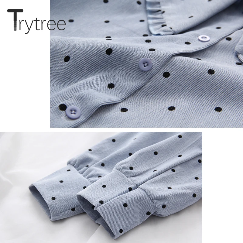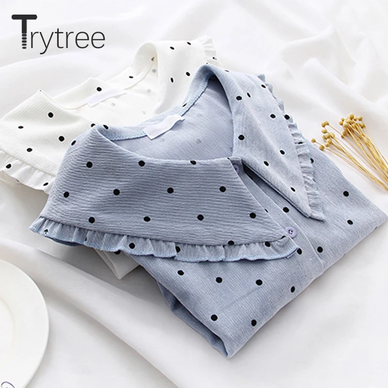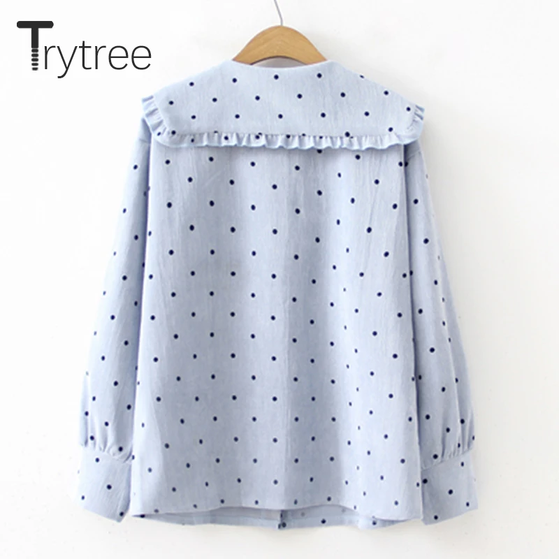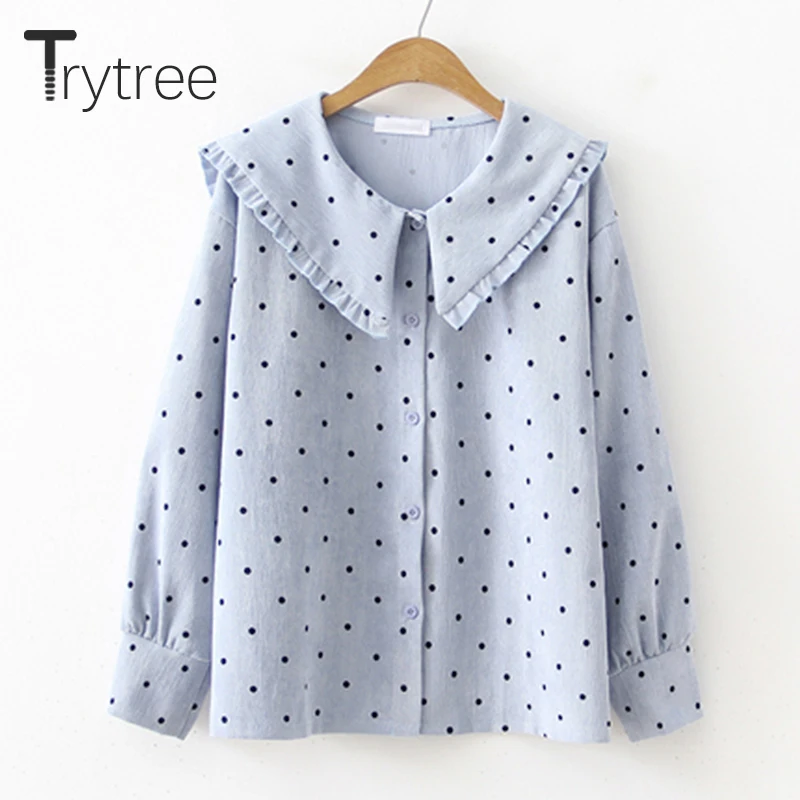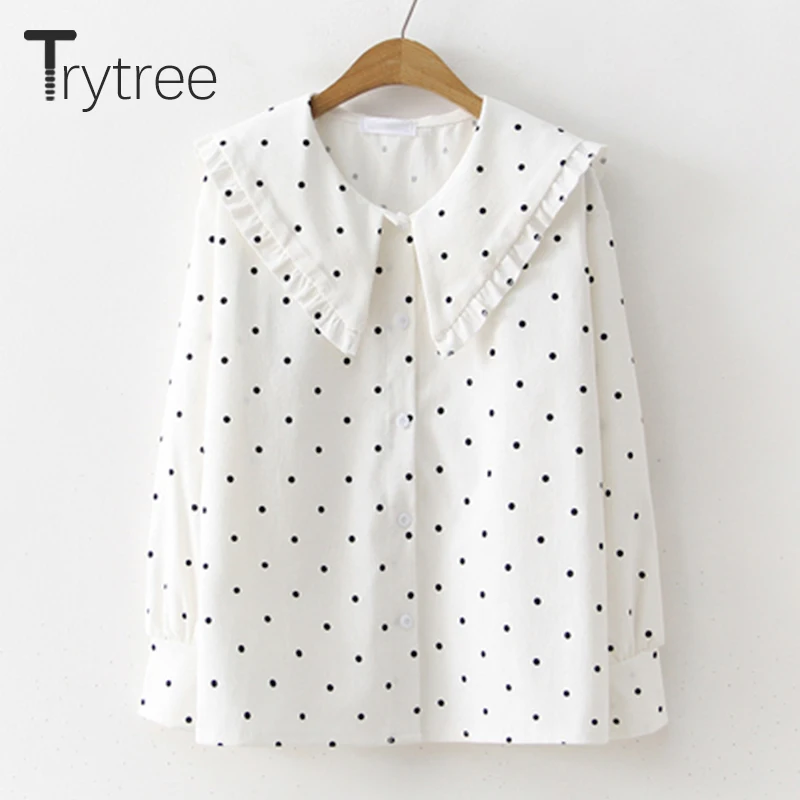 awesome Ttytree Autumn Blouses Casual Polka Dot shirt Women Peter pan Ruffles Collar Single-breasted Office