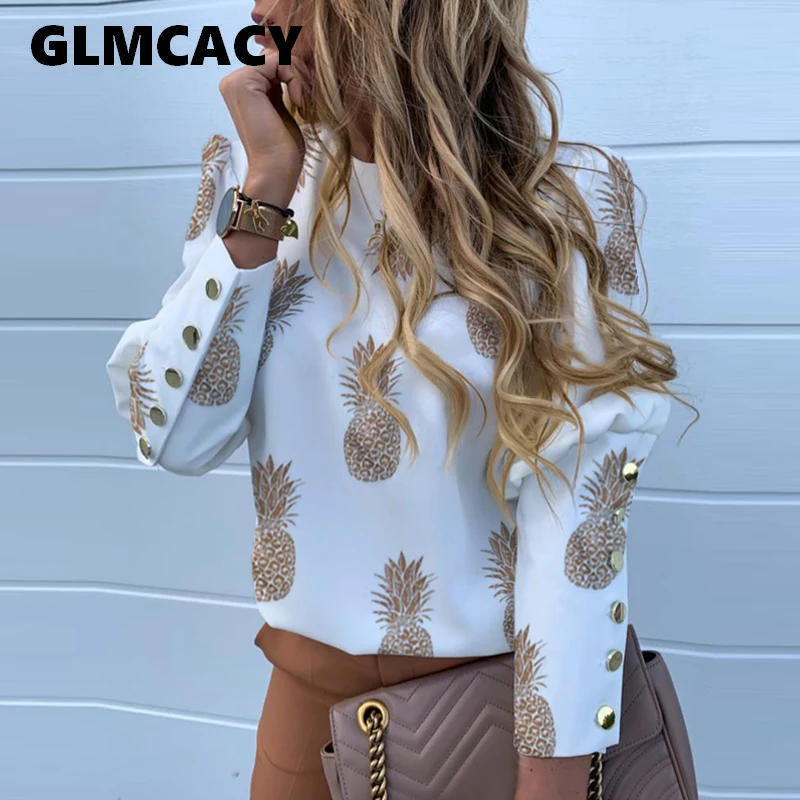 Most effective Women Pineapple Print Metal Buttoned Detail Casual Blouse O-neck Long Sleeve Chic Casual Loose Styl