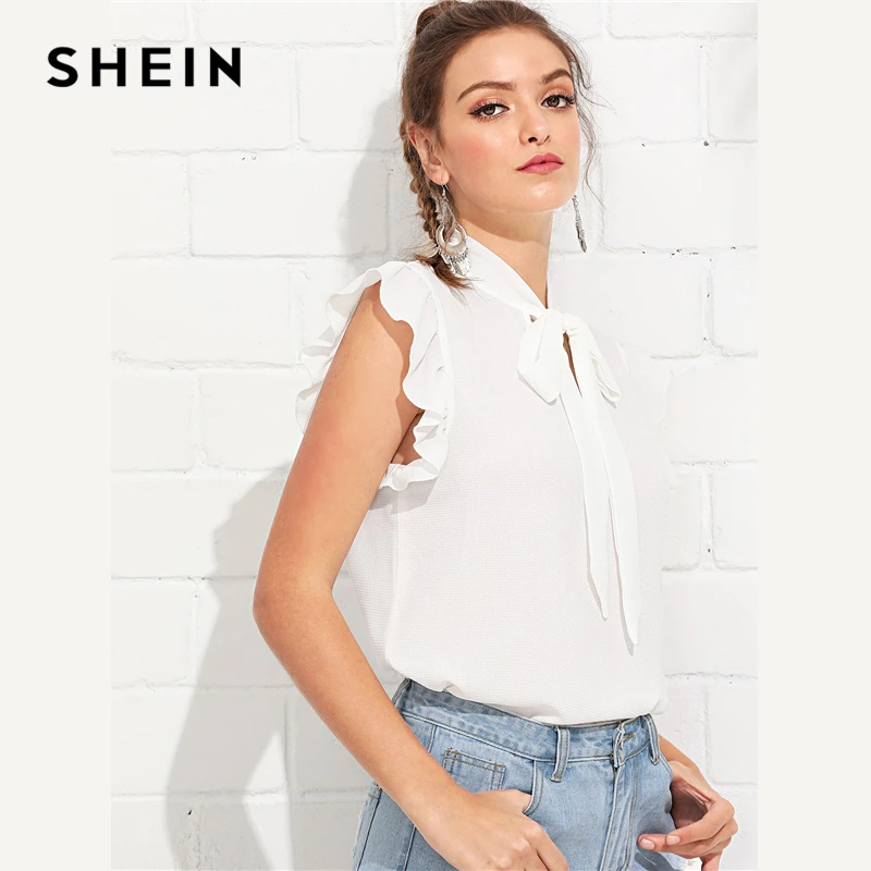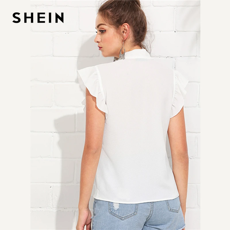 Promo SHEIN White Elegant Workwear Flounce Shoulder Tied Neck Stand Collar Ruffle Blouse Summer Women Wee