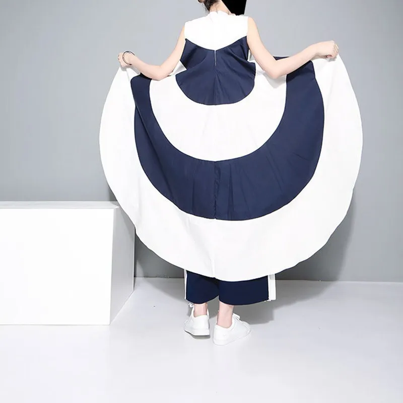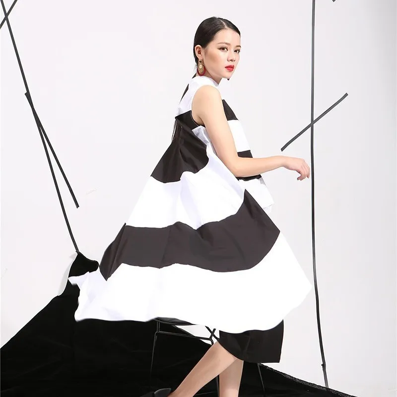 wonderful [EAM] 2020 New Spring Stand Collar Sleeveles Blue Striped Big Hem Irregular Loose Shirt Women Blous