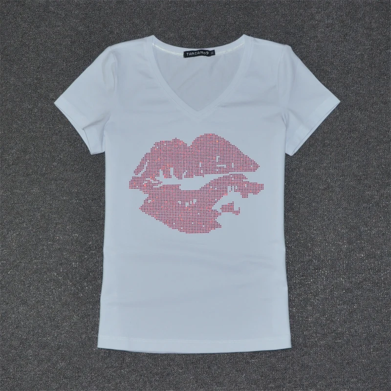 astounding Summer women Sequins Lips tshirt Drilling O-neck short sleeve Basic Bottoming Shirts Beading sexy T