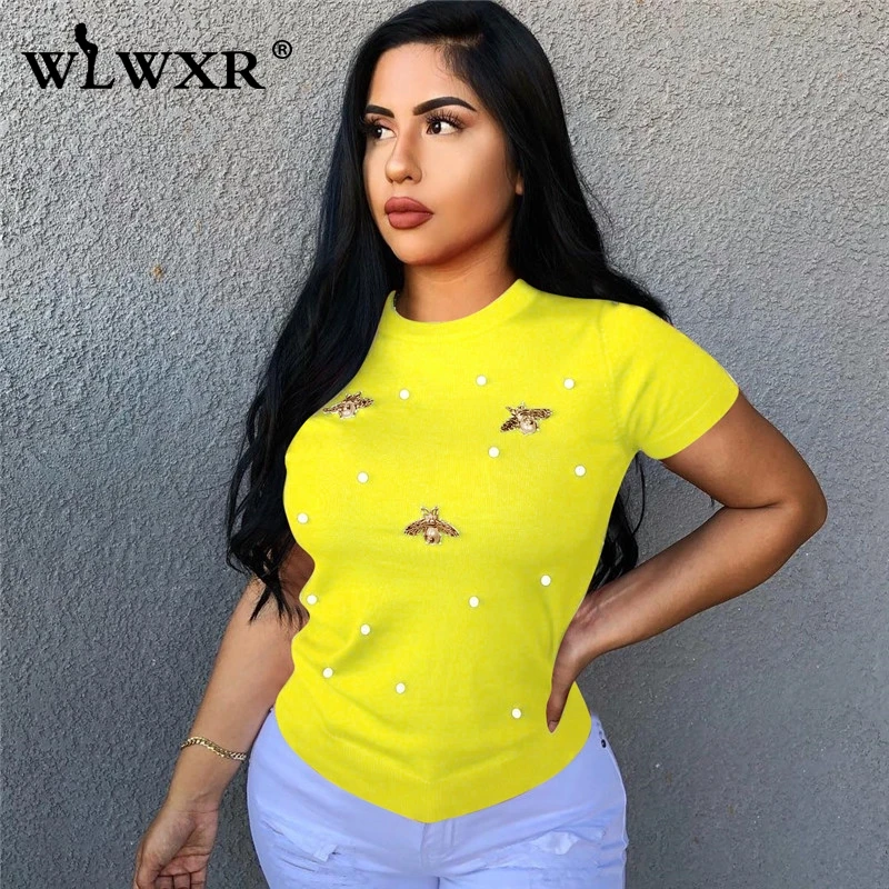 wonderful WLWXR Plus Size Women Short Sleeve Pearl Beading Tshirt Ladies Tee Tops Summer Solid Weekend Casual