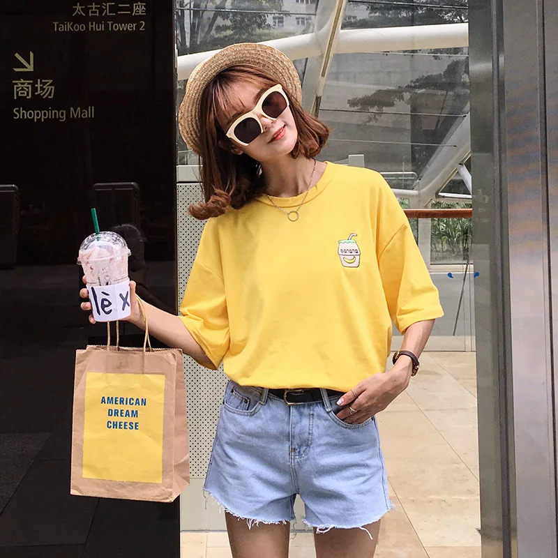 discounted Women's Casual T-shirt Kawaii Ulzzang Cartoon Kawaii Milk Bottle Embroidery Print Loose Harajuku Ts