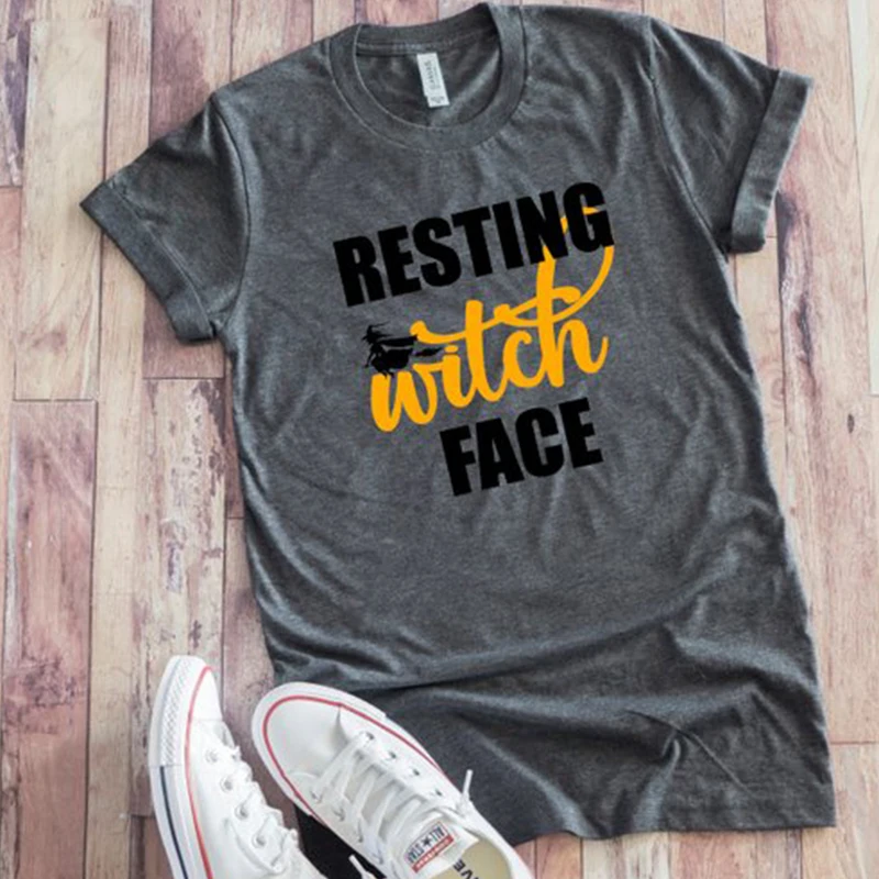 wonderful 2019 women t-shirt top resting witch face letter printed pumpkin graphic female tumblr Halloween pu