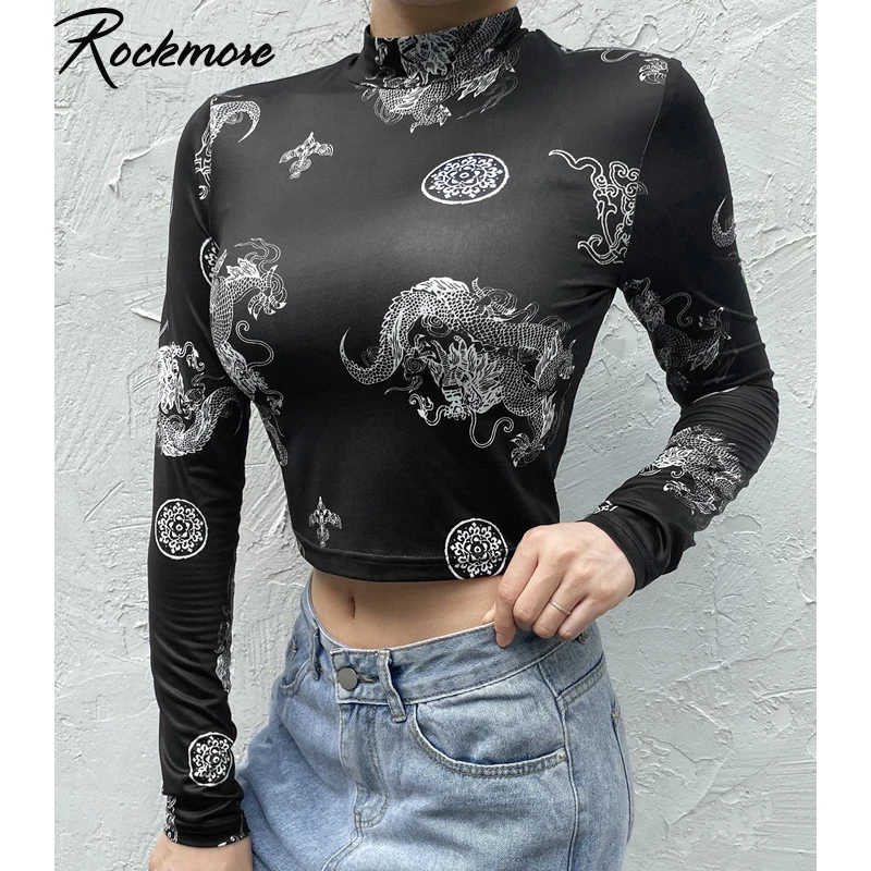 buy Rockmore Dragon Print Black T-Shirt Women Chinese Style Bodyocn Turtleneck Tshirt Long Sleeve Crop