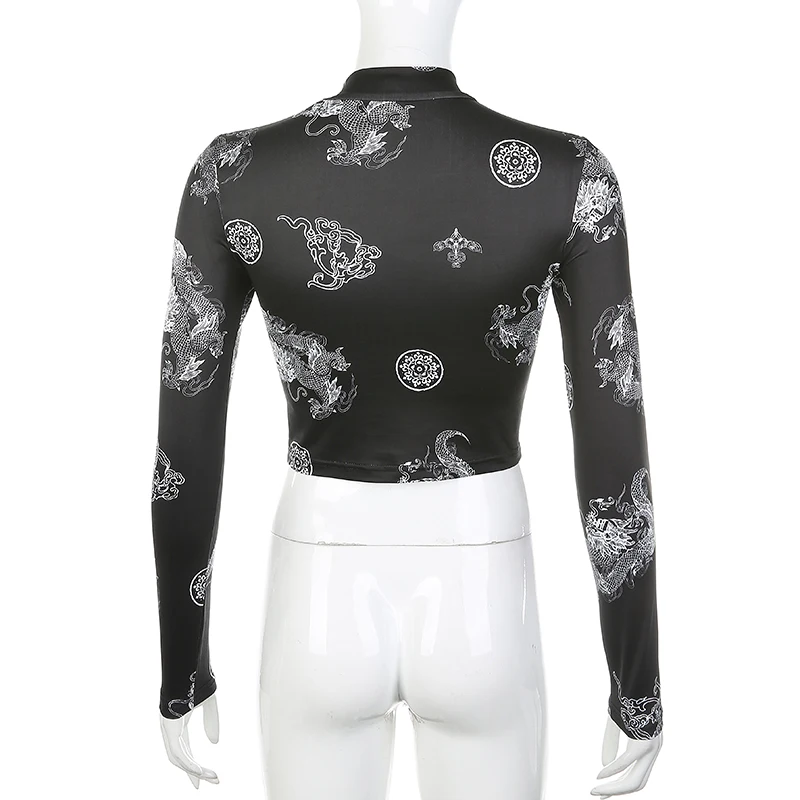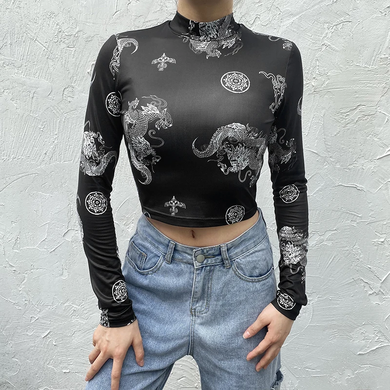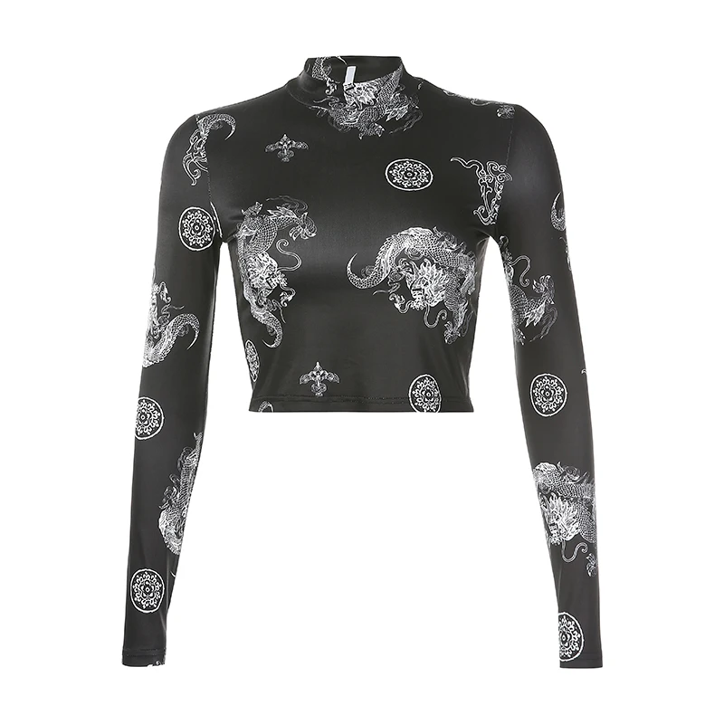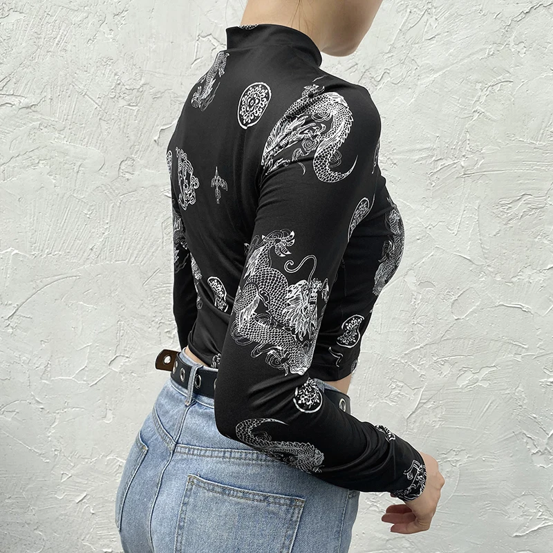lower price Rockmore Dragon Print Black T-Shirt Women Chinese Style Bodyocn Turtleneck Tshirt Long Sleeve Crop