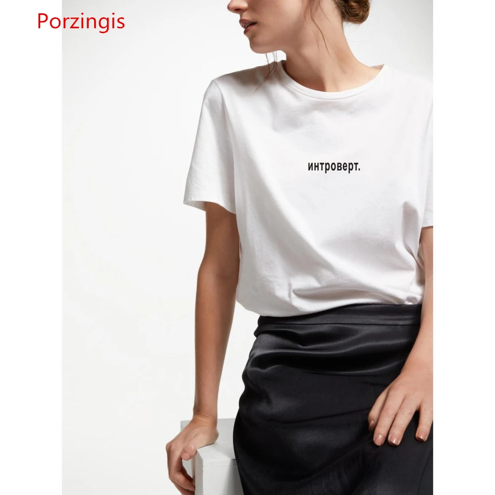Most effective Porzingis Women's Tops T-shirt Russian Letter Introvert. Inscription Print White Short Sleeve Femal