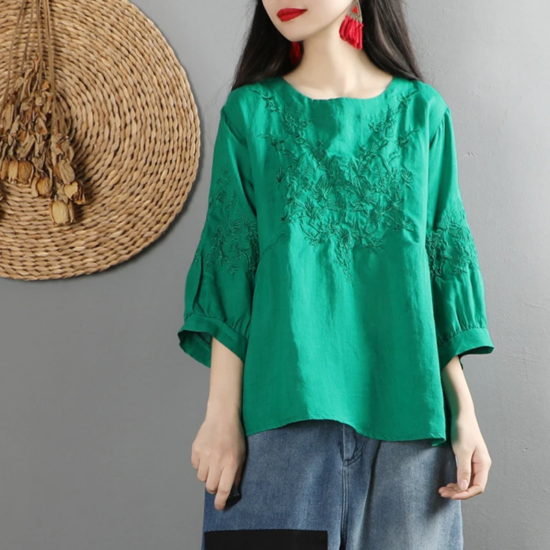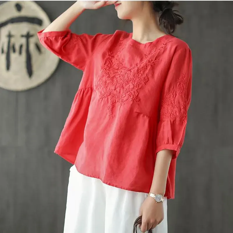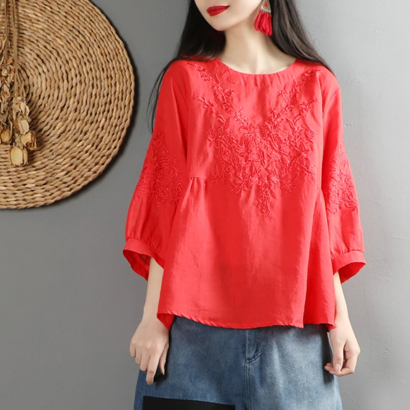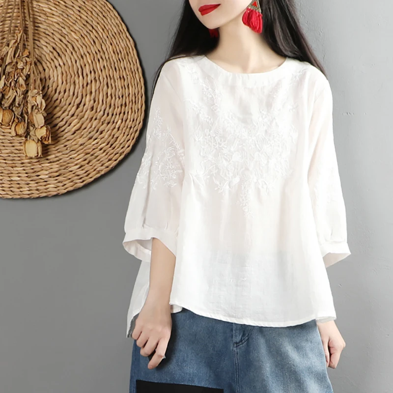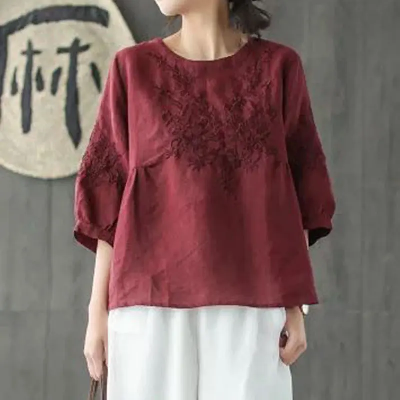 amazing F&je New Summer style Women Tshirt Plus Size O-neck Embroidery Solid cotton Tops Vintage Loose Lady